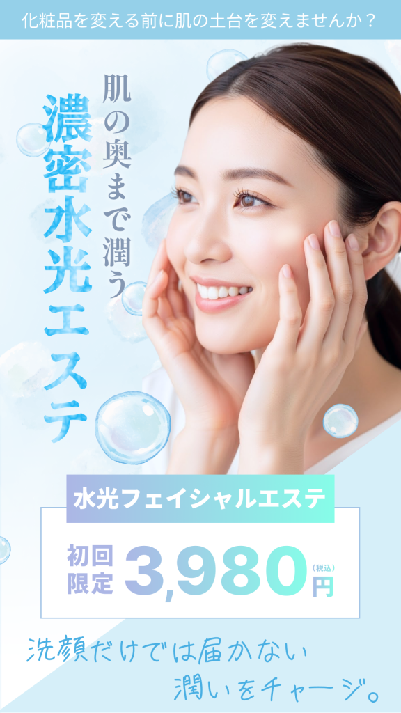 ・水を連想させるライトブルーと白を基調にし、アクセントにパープル〜グリーンのグラデーションを使うことで、単なる「水」ではなく「美容・エステ」の特別感を演出しています。